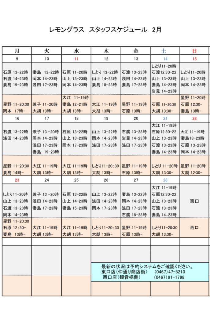 2月後半スタッフスケジュール